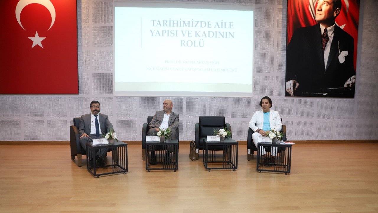 İKÇÜKAM Müdürü Prof. Dr. Fatma Akkuş Yiğit, medeniyetimizde kadının ailedeki ve toplumdaki yerini aktardığı sunumunda, Türklerde ailenin toplumun ve devletin temini olarak görüldüğünü belitti. Prof. Dr. Yiğit, “Sağlam bir toplum olabilmesi için güçlü bir aile olması şarttır. Bizim anlayışımızda, güçlü bir aile, güçlü bir toplumu, güçlü toplum da güçlü bir devlet oluşturuyor. Türkler anayurtları olan Türkistan coğrafyasından yüzyıllar içerisinde dünyanın pek çok yerine dağılmış ve pek çok yerde devlet kurmuş büyük bir millet. Pekâlâ, bu dağınıklığa rağmen Türk milleti nasıl ayakta kalabildiği sorusuna baktığımız zaman burada biz iki faktörü görüyoruz. Birincisi aile, ikincisi de ordu. O sebeple Türk milletinin ayakta ve sağlam olarak kalabilmesinde ailenin oldukça büyük bir rolü var ve ordunun da güçlü olması, ailenin güçlü olmasına bağlı olduğunu rahatlıkla görebiliyoruz. Orhun Yazıtları ve Dede Korkut hikayeleri ve hatta ondan önce eski metinlerde aile ve akrabalık ilişkilerine dair çok farklı ve fazla kelime görüyoruz. Eski Türkçede aile ‘oguş’ olarak isimlendiriliyor. Ailelerin bir araya gelmesi ile uruglar, uruglar bod (boy, kabile), bodun (boylar birliği) ve il (devlet) oluşumunu görüyoruz. Bodunu özellikle vurgulamak istiyorum. Çünkü boylar aile ile devlet arasında bir aracı. Bu boyların hanedanlıkları kurduğunu görüyoruz. Türkiye'ye en çok göç eden Türkler Oğuz boylarıdır. Oğuz boyları içerisinde mesela Selçuklular, Kınık boyundan, Osmanlılar da Kayı boyundandır. Bundan dolayı bu boylar devletle aile arasında önemli bir iletişim aracı olduğunu tarih boyunca görüyoruz” ifadelerini kullandı.