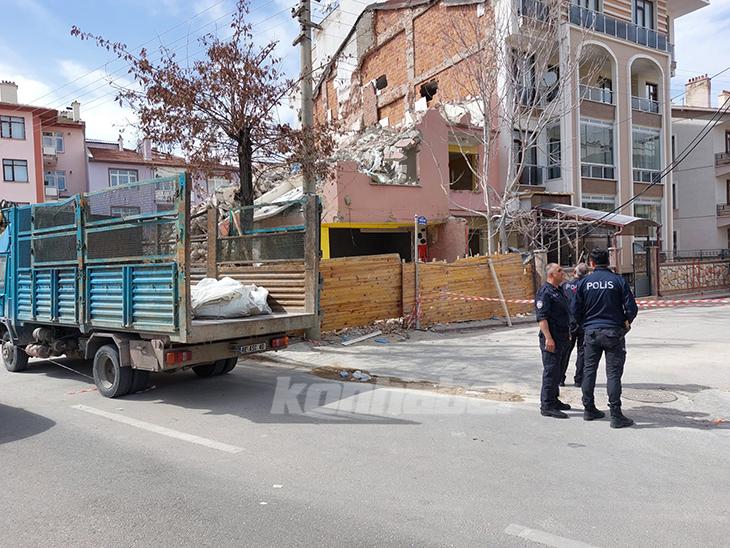 Konya’da eski bir binanın yıkımını yapan iş makinası, yan binadaki bir dairenin oturma odasının duvarını yıkıp içeriye girdi. O sırada salonda oturan 2 kişi kazadan yara almadan kurtuldu.
