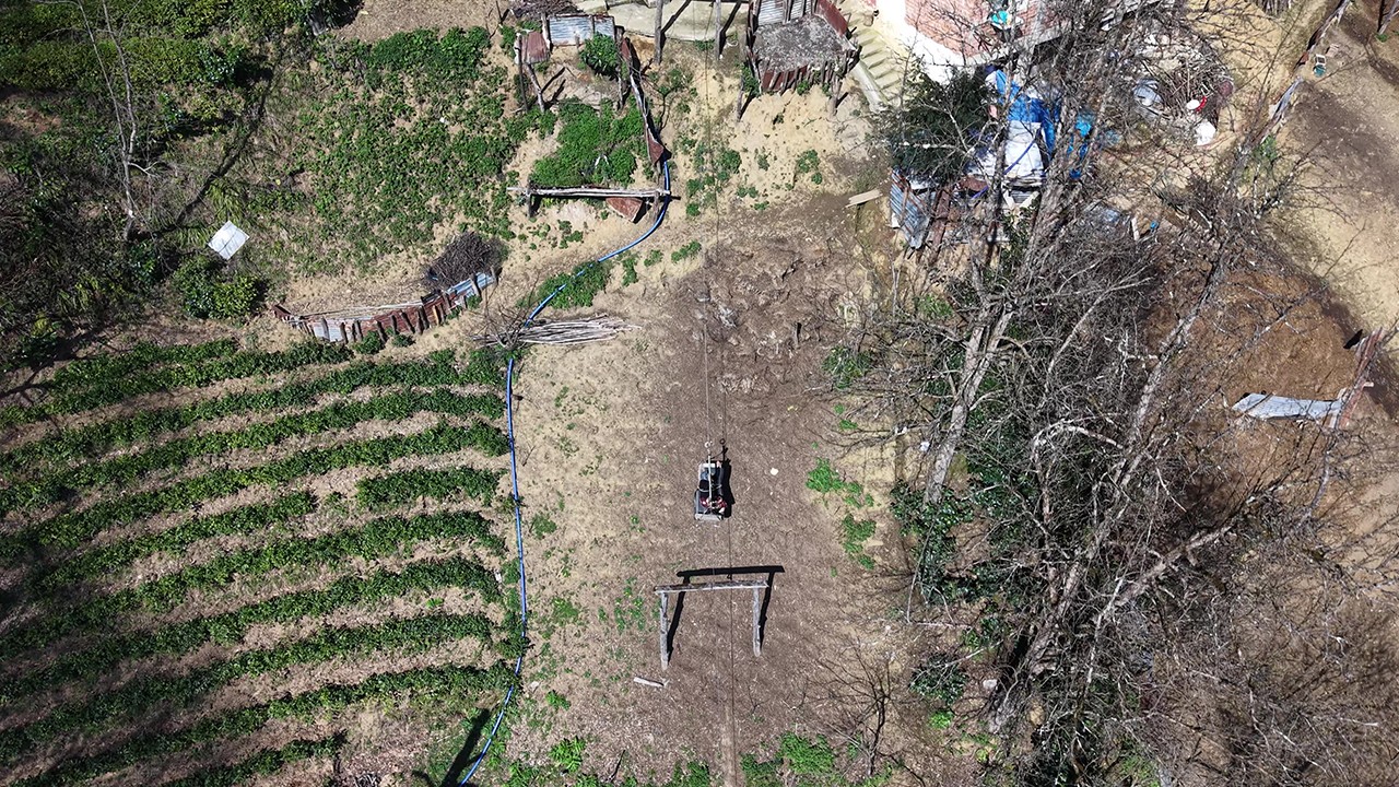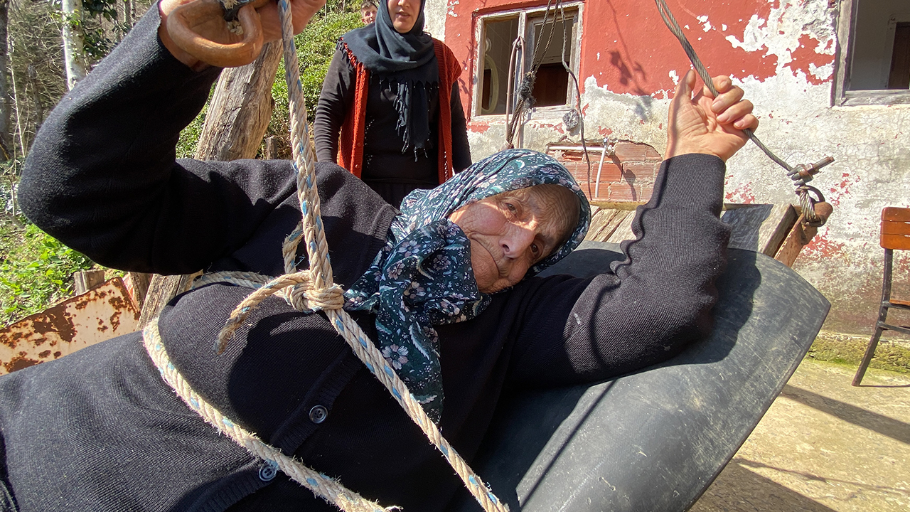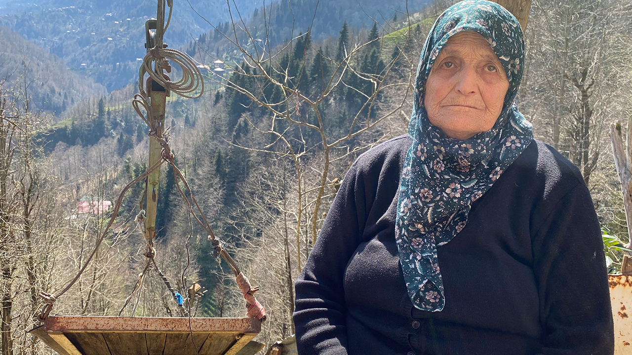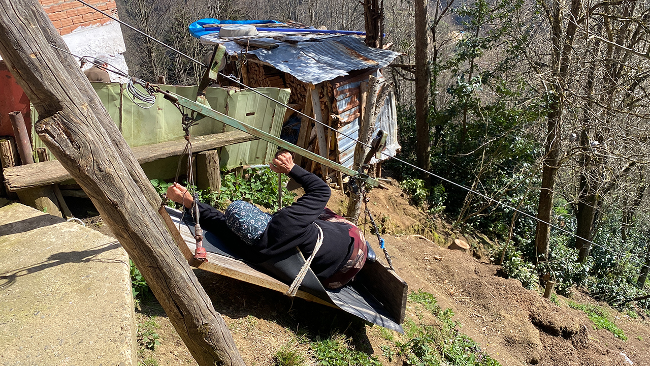 Çayeli ilçesine bağlı Kaptanpaşa köyünde sarp arazi üzerine inşa edilen 2 katlı evde yaşayan Makbule Bozkurt, araç yoluna 110 metre uzaklıktaki evine ulaşmak için 20 yıl önce yük taşımak için kurulan teleferiği kullanıyor.