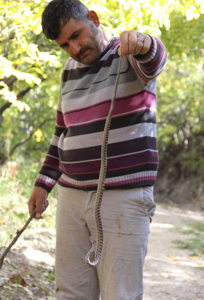 Bilgidin dag yilani. Koyde cocuklar oynuyor. Anlamadigim hayvana ne eziyet ediyorsun birak gitsin sende yoluna git. Engerek olsa duramazdin merak etme