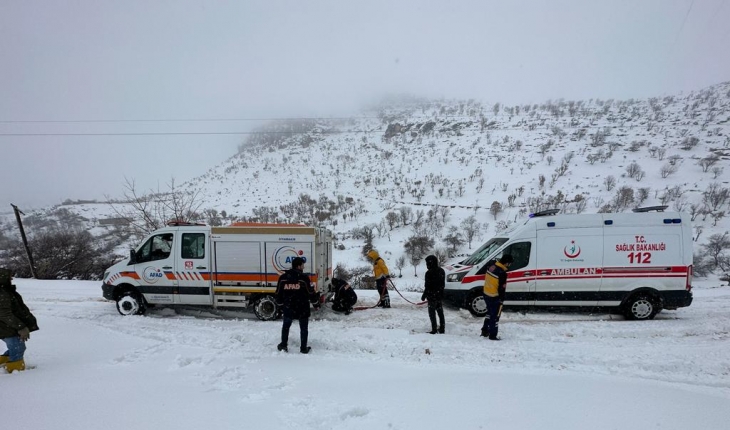 Diyarbakır'ın Hazro ilçesinde kar nedeniyle ulaşıma kapanan kırsal mahallede rahatsızlanan hasta AFAD ve 112 Acil Sağlık ekiplerinin yardımıyla hastaneye götürüldü.