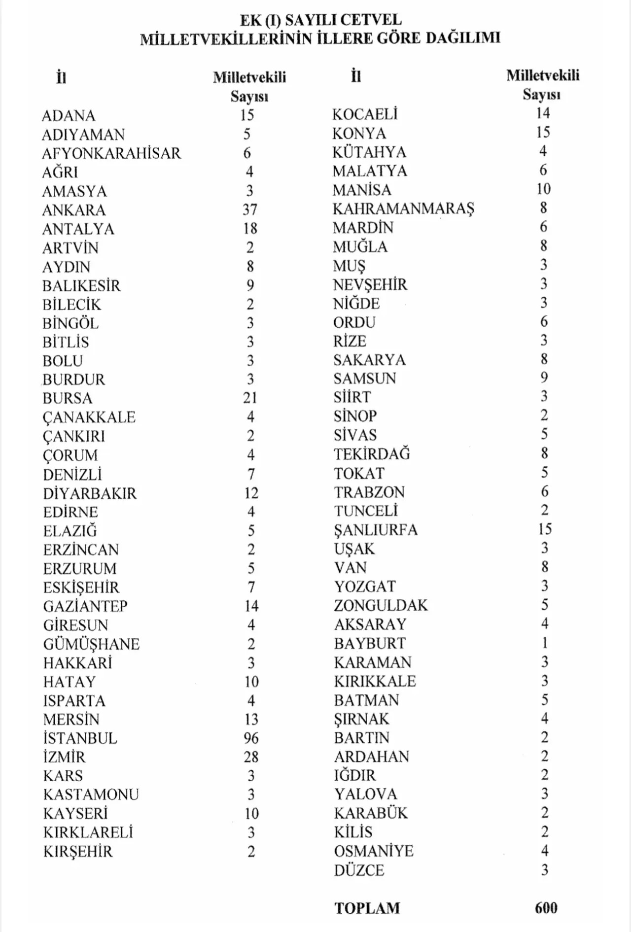 Yapılan tespit sonunda çıkaracağı milletvekili sayısı 18'e kadar olan iller bir, çıkaracağı milletvekili sayısı 19'dan 35'e kadar olan iller iki, 36 ve daha fazla olan iller üç seçim çevresine bölündü. Böylelikle 600 milletvekilinin 81 ile dağılımı yapıldı.