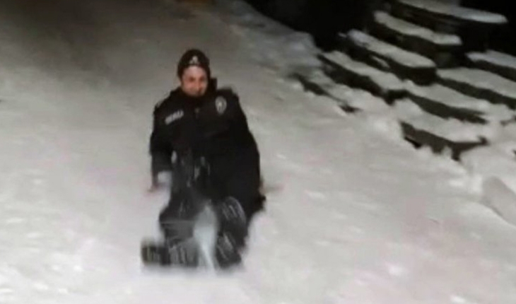 Bölgeye giden bekçiler, küçük çocukların keyfini bozmayarak onlarla birlikte kayak yaptı.