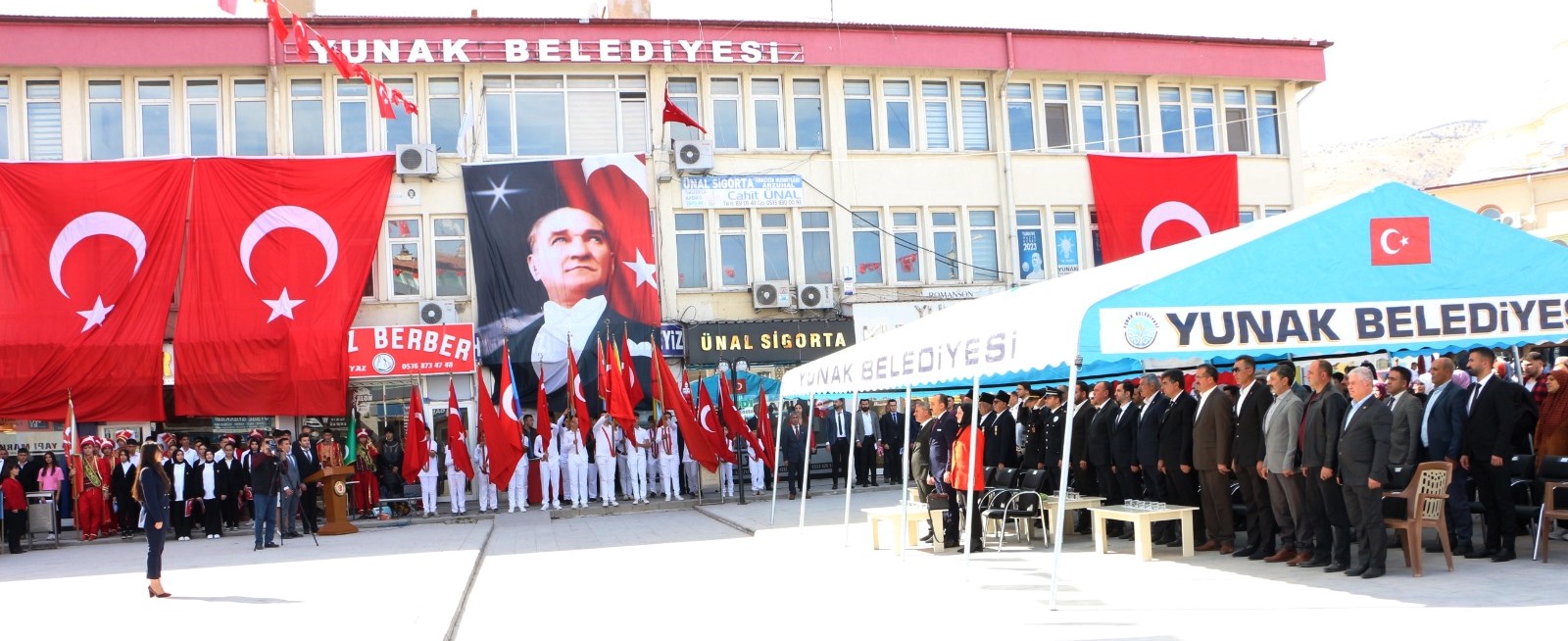 Yunak Belediyesi önünde düzenlenen kutlama programı resmi geçit töreni ile sona ererken törenlere, Yunak Kaymakamı Özgür Pelvan, Belediye Başkanı Subhan Günaltay, Cumhuriyet Savcısı Berşan Özdil, İlçe Milli Eğitim Müdürü Mahmut İşcan, Şube Müdürü Abdullah Tunçez, kamu kurum ve kuruluşlarının amirleri, siyasi parti temsilcileri, STK temsilcileri, okul müdürleri, öğretmenler, öğrenciler ve vatandaşlar katıldı.