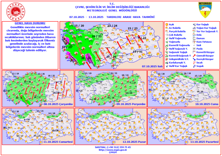 Hava sıcaklıklarının, yarından itibaren batı kesimlerden başlayarak mevsim normallerinin altına düşeceği tahmin ediliyor. Ayrıca yarın kuvvetli yağış beklenen 20 il için "turuncu" ve "sarı" kodlu uyarıda bulunuldu.