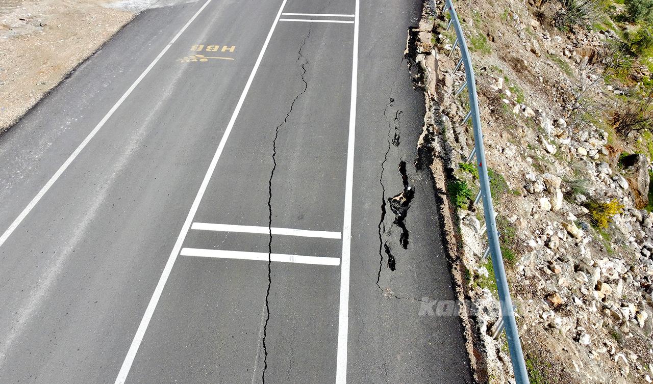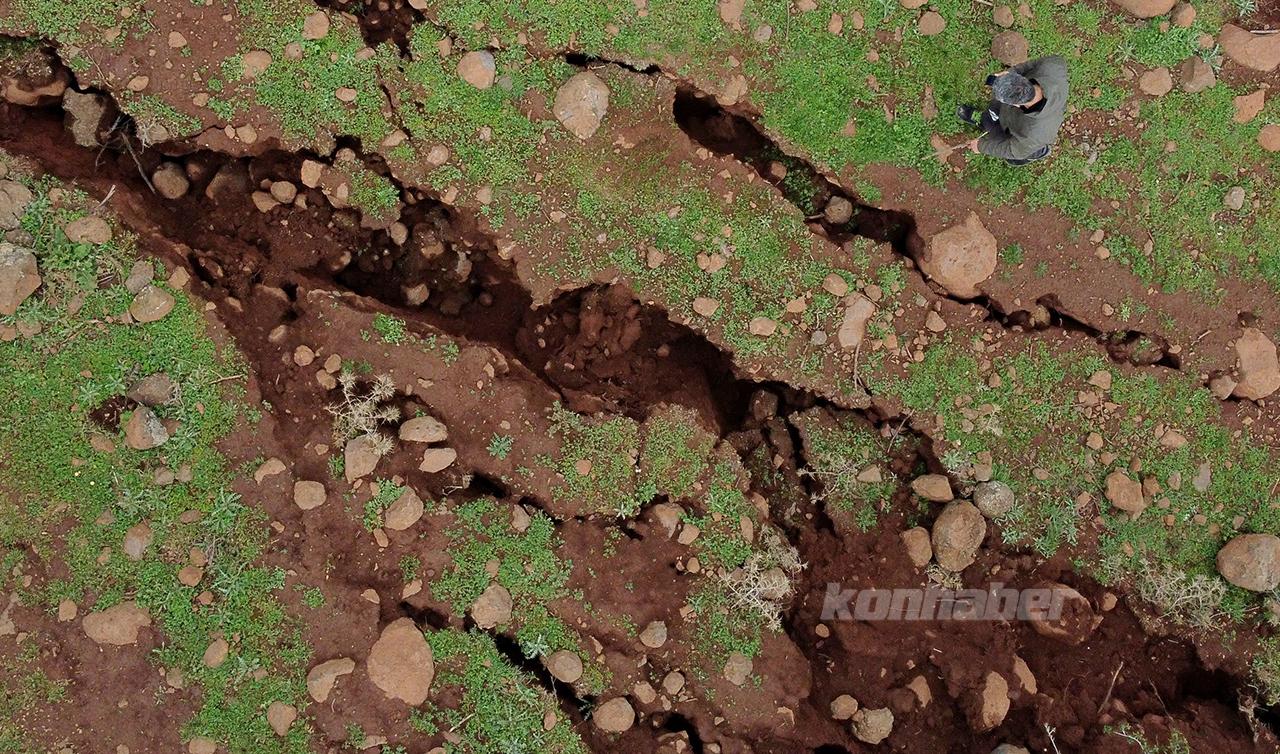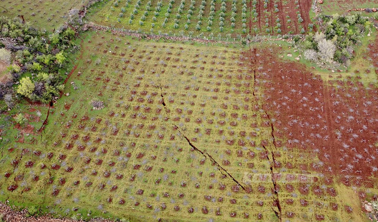 "Asrın felaketi" olarak nitelenen depremler sonucu Hatay'ın Hassa ilçesindeki tarım arazileri, ormanlık alanlar ve yollarda oluşan yüzey kırıkları ile çökmeler afetin büyüklüğünü yansıtıyor.