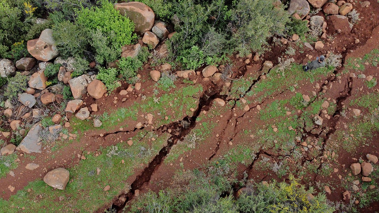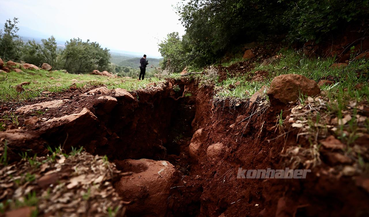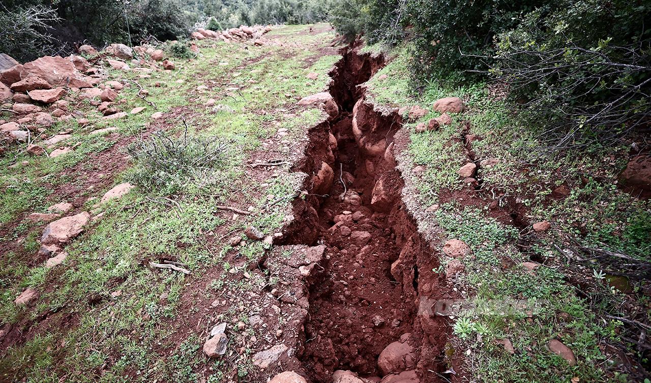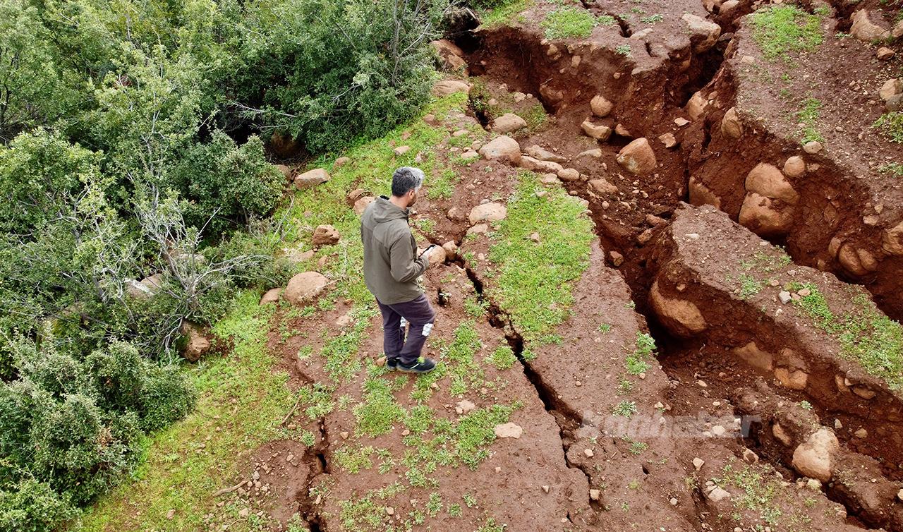 "Asrın felaketi" olarak nitelenen depremler sonucu Hatay'ın Hassa ilçesindeki tarım arazileri, ormanlık alanlar ve yollarda oluşan yüzey kırıkları ile çökmeler afetin büyüklüğünü yansıtıyor.