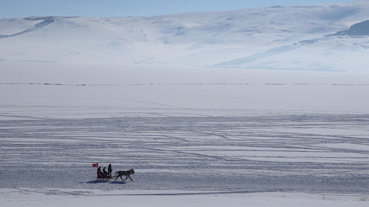 Yüzeyinin tamamı kar ve buzla kaplı Ardahan ile Kars arasındaki Çıldır Gölü'nde atlı kızak heyecanı devam ediyor.