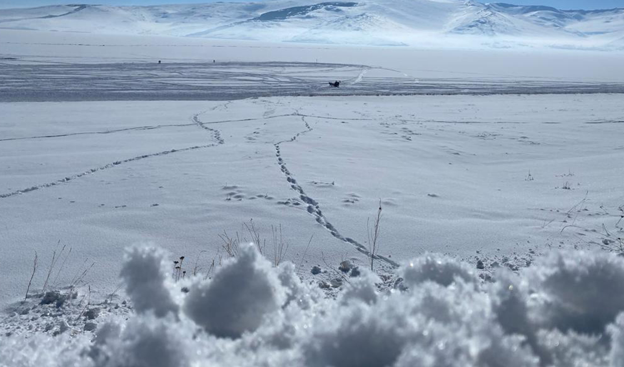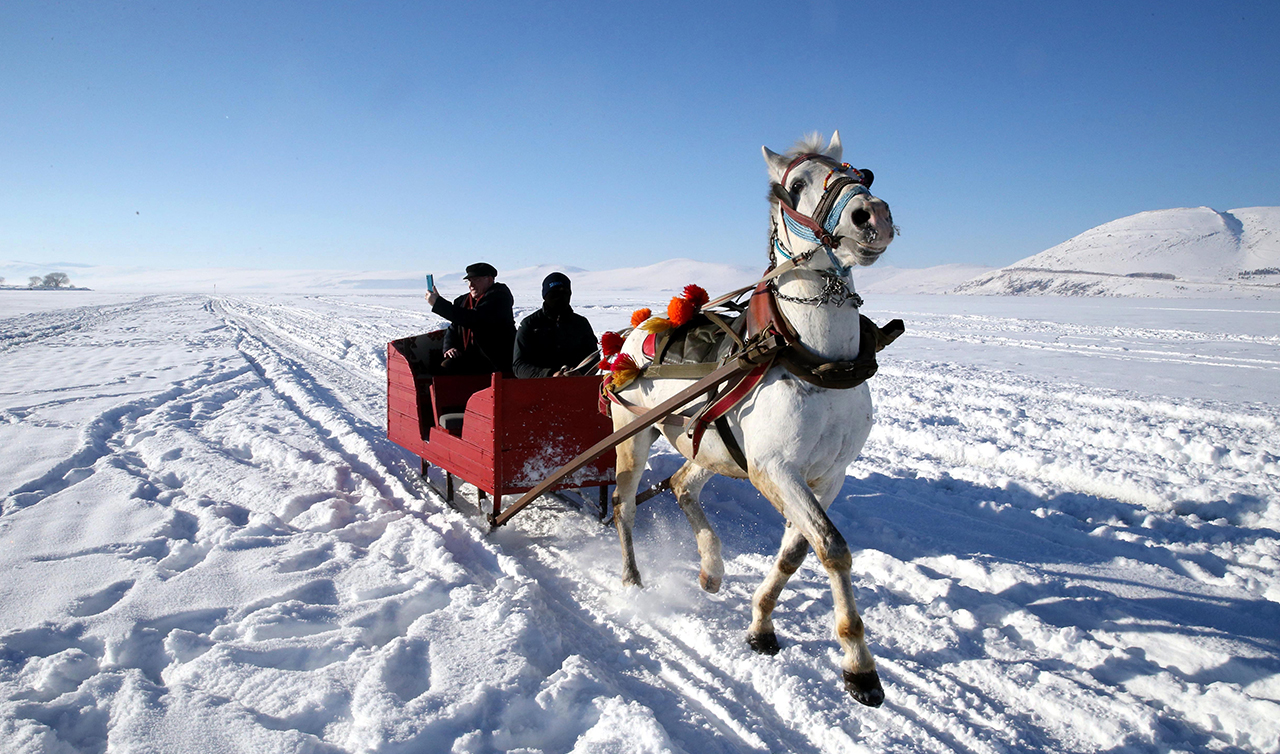 Gölün, Ardahan tarafındaki kıyı kesimlerine gelen yerli ve yabancı turistler, buzla kaplı göl üzerinde yürüyüş yapıp, atlı kızaklarla gezinti yapıyor.