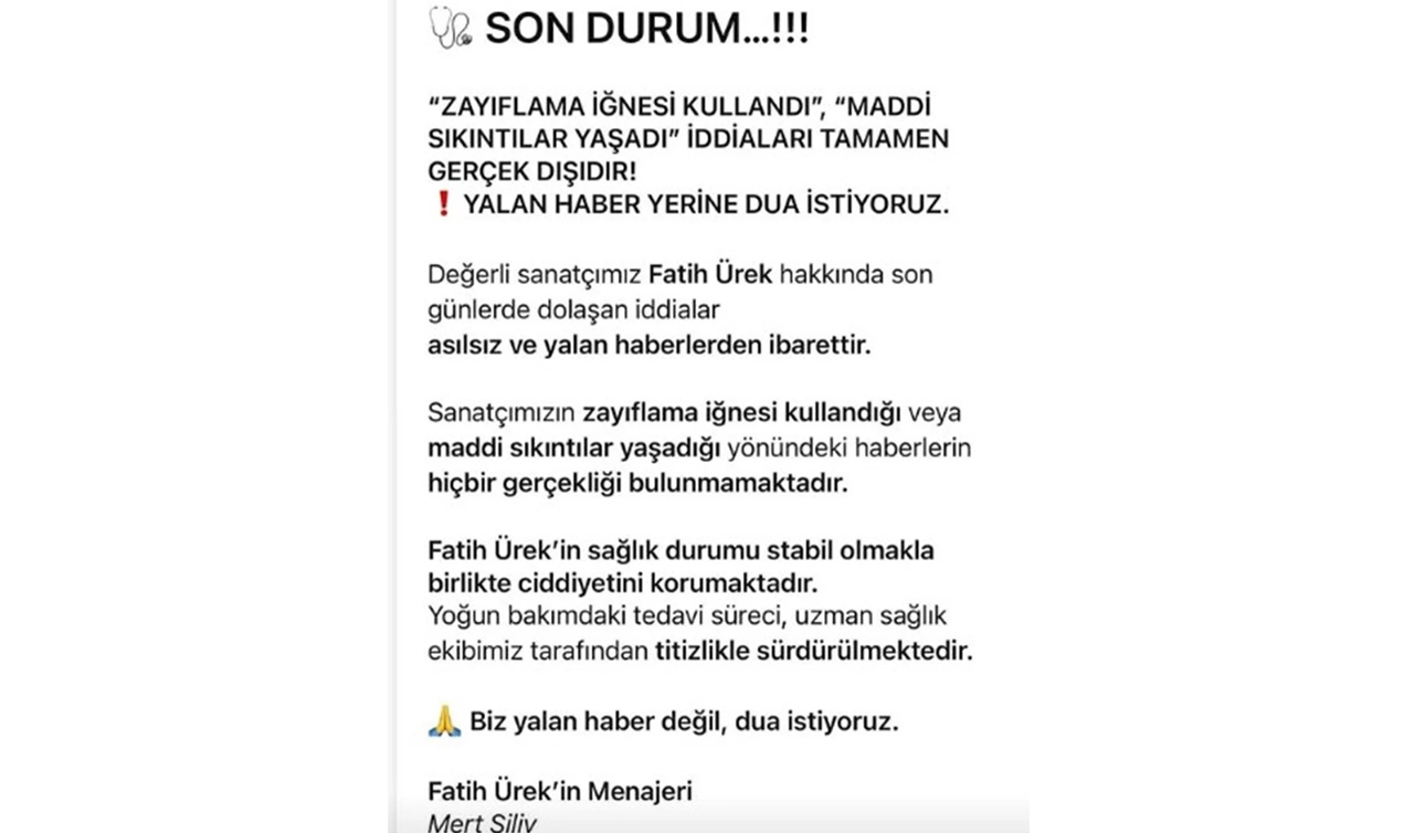 Yalan haber yerine dua istediklerini dile getiren Siliv, "Sanatçımız zayıflama iğnesi kullandığı veya maddi sıkıntılar yaşadığı yönündeki haberlerin hiçbir gerçekliği bulunmamaktadır." dedi.