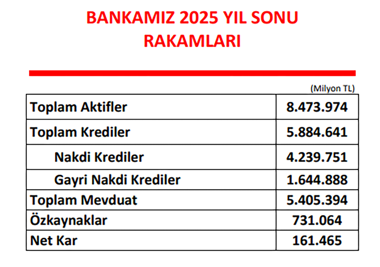 2025 yılı sonunda 161 milyar TL net kâr elde eden Banka; aktif büyüklük, toplam krediler, mevduat, özkaynaklar, net kâr, tarım kredileri, ihracat kredileri, dış ticaretin finansmanı, yurt dışı finansman temini, aktif dijital müşteri, konut kredileri ile TL ve YP nakdi ve gayrinakdi kurumsal krediler alanlarında sektör liderliğini sürdürmüştür.