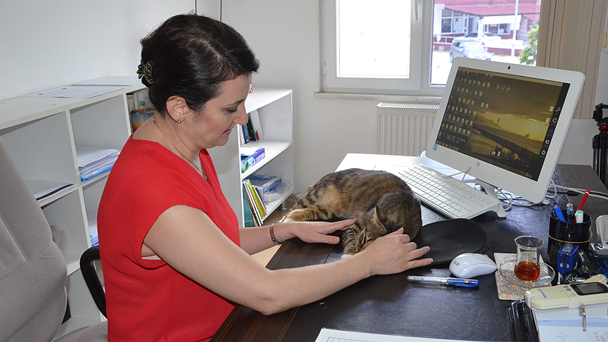 Yalova'nın Çınarcık ilçesine bağlı Esenköy Belde Belediyesinin yönetici ve çalışanları, makam odalarını, masalarını ve hatta oturdukları koltukları kedilerle paylaşıyor.