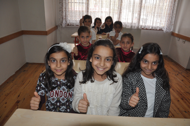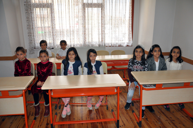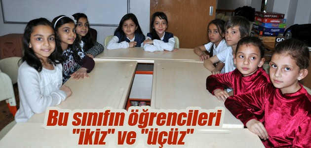 Sınıfta üçüzler 10 yaşındaki Nehir, Asya ve İdil İlhan ile 9 yaşındaki ikizler İsmail ve Emine Kayıhan, Fatma Rübeyda ve Havvanur Yümünlü (solda), Fatma Erva ve Eslem Berra Altuntaş (ortada)