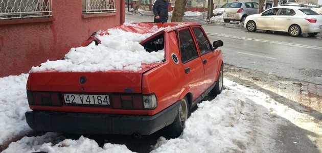 Konya'nın Meram İlçesi Abdülaziz Mahallesi, Haznedar Sokakta park halinde bulunan 42 V 4184 plakalı otomobilin üzerine çatıdan kopan kar kütlesi düştü. Olayda yaralanan olmadı. Tavan kısmı çöken otomobil büyük hasar gördü.