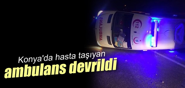 Konya'da hasta taşıyan ambulans, buzlanma nedeniyle devrildi.