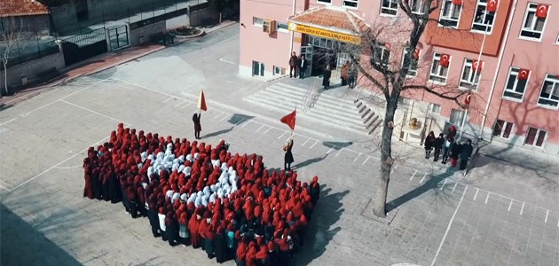 Yapılan çalışmada öğrenciler okul bahçesinde bir araya gelerek ay-yıldızlı Türk bayrağı oluşturdu.