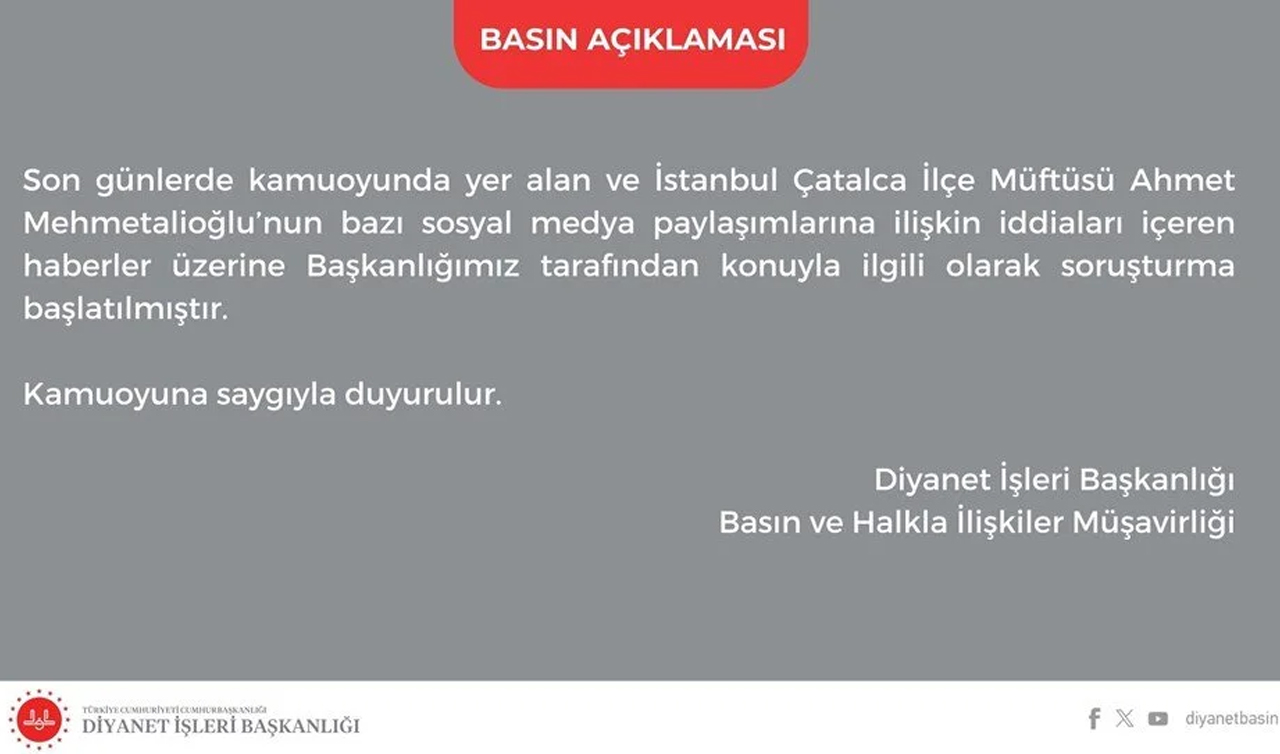 Diyanet İşleri Başkanlığından yapılan açıklamada, "Son günlerde kamuoyunda yer alan ve İstanbul Çatalca İlçe Müftüsü Ahmet Mehmetalioğlu'nun bazı sosyal medya paylaşımlarına ilişkin iddiaları içeren haberler üzerine Başkanlığımız tarafından konuyla ilgili olarak soruşturma başlatılmıştır." ifadesine yer verildi.