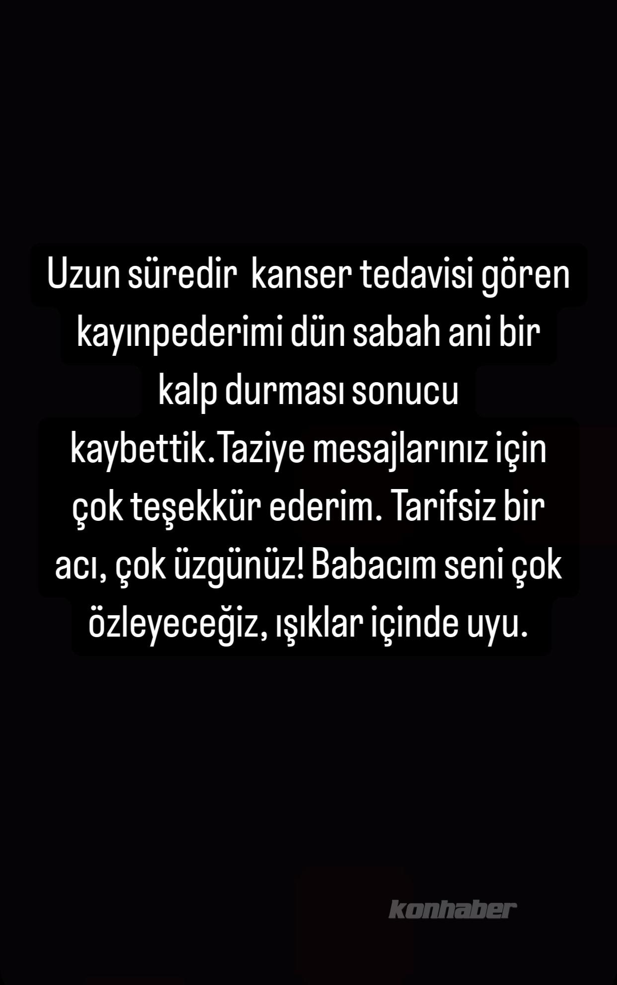 "Uzun süredir kanser tedavisi gören kayınpederimi dün sabah ani bir kalp durması sonucu kaybettik. Taziye mesajlarınız için çok teşekkür ederim. Tarifsiz bir acı, çok üzgünüz. Babacım seni çok özleyeceğiz, ışıklar içinde uyu.” sözleriyle takipçileriyle Instagram’da paylaştı.