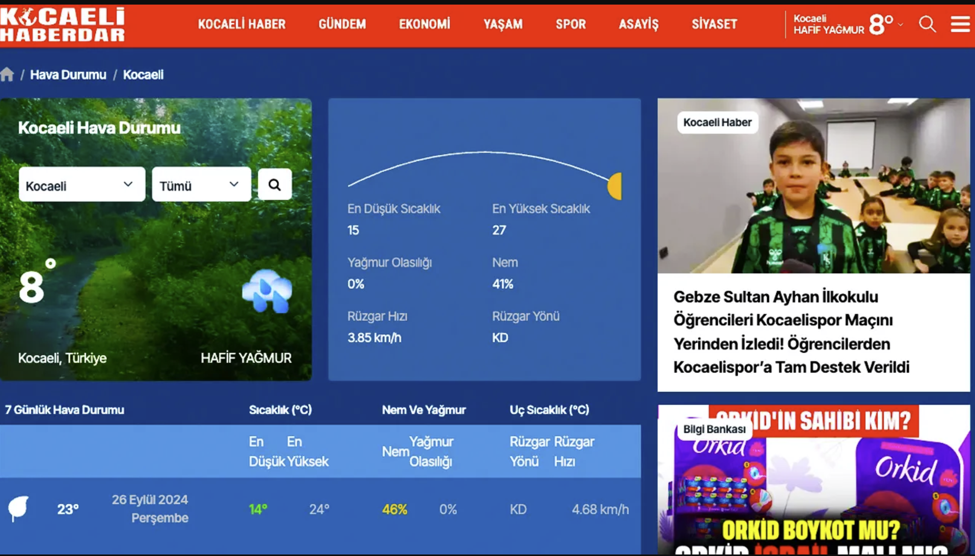 Güne başlamadan önce hava durumunu kontrol etmek, günlük planlarımızı yapmak için önemli. Kocaelihaberdar.com.tr, güncel hava durumu bilgilerini anlık olarak sunuyor. Sıcaklık, nem, yağış olasılığı gibi detaylı bilgilere kolayca ulaşabilir, gününüzü hava koşullarına göre planlayabilirsiniz.