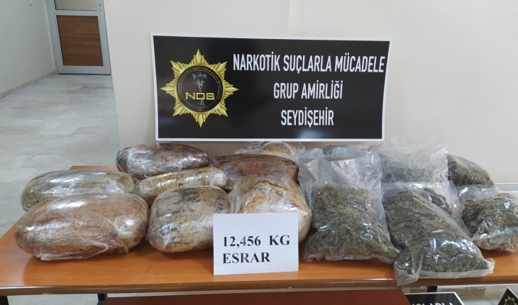 Edinilen bilgiye göre, Konya Narkotik Suçlarla Mücadele Şube Müdürlüğü ve Seydişehir Narkotik Büro Amirliği ekipleri, bir ihbar üzerine Antalya Çevreyolu Bozkır Kavşağı'nda bir aracı durdurdu. İçerisinde 5 kişinin bulunduğu araç, detaylı arama yapmak için Seydişehir İlçe Emniyet Müdürlüğüne götürüldü. Araçta yapılan incelemede arka kısımda hazırlanan özel bölmede gizlenmiş 12 kilo 456 gram kubar esrar ele geçirildi. Gözaltına alınan H.K., I.K., E.D., G.K. ve K.A., Seydişehir Devlet Hastanesinde sağlık kontrolünden geçirildikten sonra ifadeleri alınmak üzere tekrar emniyete götürüldü.