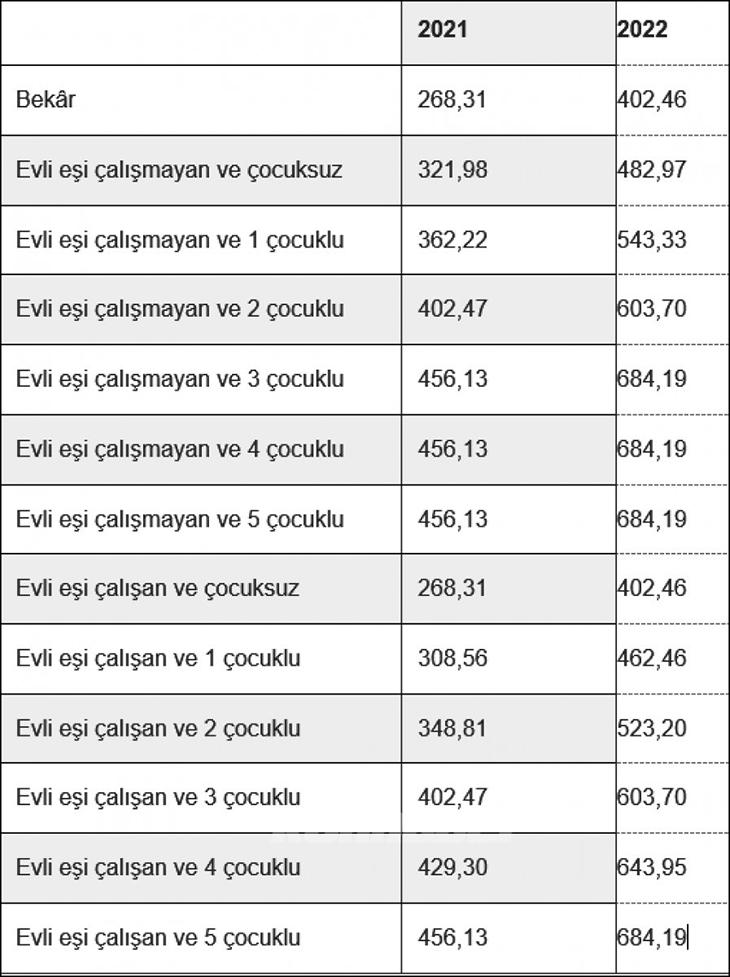 2022 asgari ücreti, bir önceki yıla oranla yüzde 50,4 artışla 4 bin 253 liraya çıktı. En düşük AGİ ise 402 lira oldu.