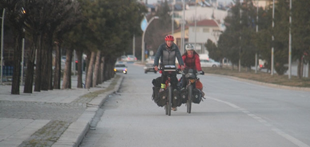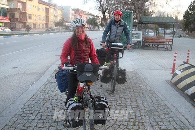 Biriktirdikleri parayla İngiltere'den dünya turuna çıkan bisiklet tutkunu çift, Konya'nın Beyşehir ilçesinde mola verdi.