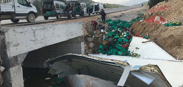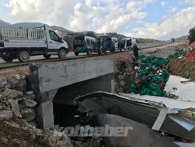 Kaza, dün sabah saatlerinde Antalya Akseki-Manavgat karayolu Geriş kavşağı yakınlarında meydana geldi. Antalya'dan yüklediği sebze ve meyveleri bir market zincirinin Konya'daki depolarına götüren Adem Gülsatar idaresindeki 07 AOE 439 plakalı tır, Antalya - Konya karayolu Geriş kavşağı yakınlarında bölünmüş yol inşaat çalışması yapılan menfeze devrildi.