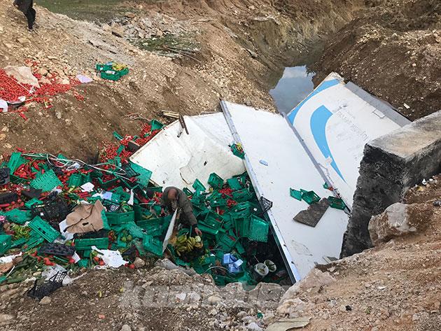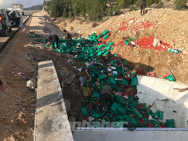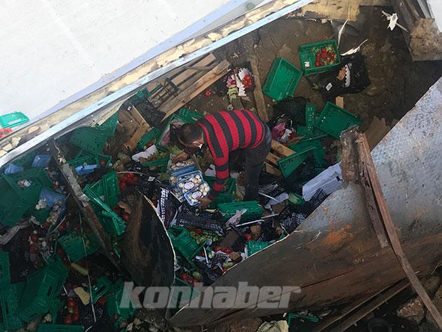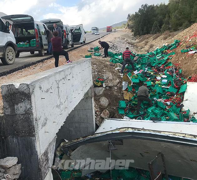 Kontrolden çıkarak devrilen ve sürücüsü hayatını kaybeden tırda bulunan sebze ve meyveler vatandaşlar tarafından kapışıldı. Yol kenarında araçlarını durduran vatandaşlar firmanın inceleme yapıp toplatmadığı meyve sebzeleri poşetlere ve kasalara doldurup araçlarına yükledi.