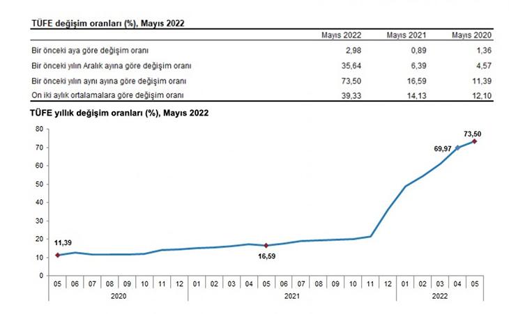 TÜFE'de 2022 yılı Mayıs ayında bir önceki aya göre yüzde 2,98, bir önceki yılın aralık ayına göre yüzde 35,64, bir önceki yılın aynı ayına göre yüzde 73,50 ve on iki aylık ortalamalara göre yüzde 39,33 artış gerçekleşti.