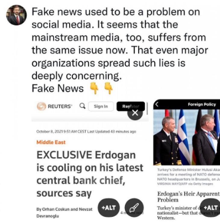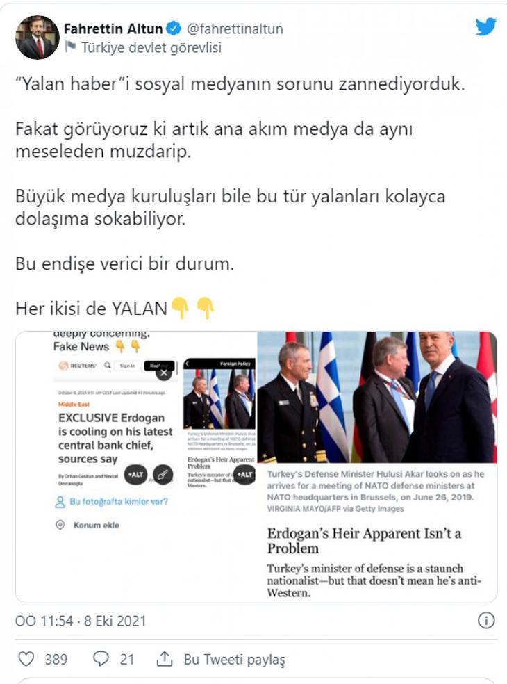 Cumhurbaşkanlığı İletişim Başkanı Fahrettin Altun, Reuters ve Foreign Policy’nin Türkiye ile ilgili uydurma bir haberini, “yalan habere” örnek olarak gösterdi.
