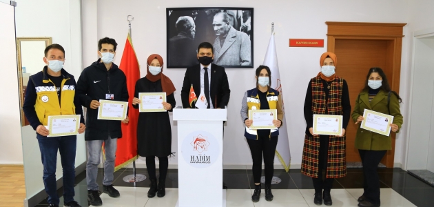 Konya'nın Hadim İlçe Kaymakamı Tufan Bağır Gilan, korona virüs salgını sürecinde başarılı çalışmalarda bulunan Hadim Toplum Sağlığı Merkezi mobil aşı ekibindeki sağlık çalışanlarına başarı belgesi verdi.