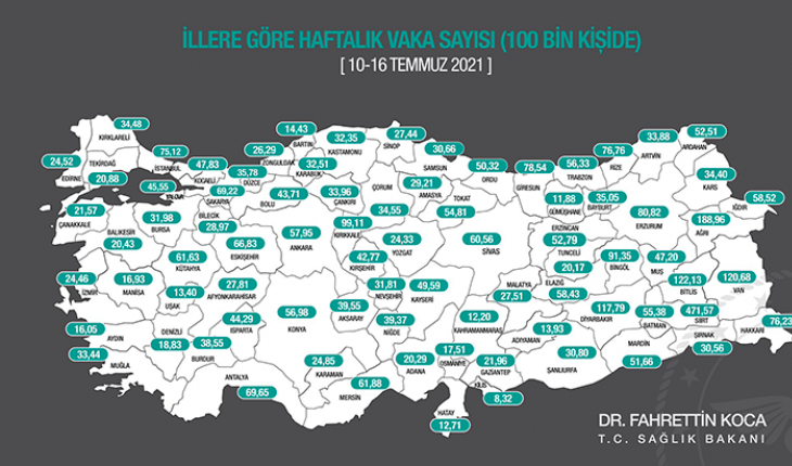 Sağlık Bakanı Fahrettin Koca, 10-16 Temmuz arasında illere göre her 100 bin kişide görülen Kovid-19 vaka sayılarını açıkladı.