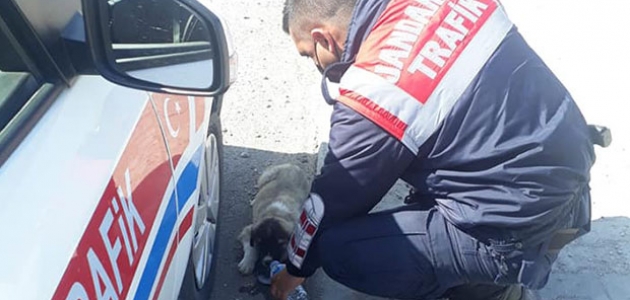 İlçede devriye görevinde bulunan jandarma ekibi, Türkmen Köyü Caddesinde yol kenarında yavru köpeği gördükten sonra durdu. Köpeğin aç ve susuz olduğunu fark eden ekipler, besledikleri yavruya su verdi.