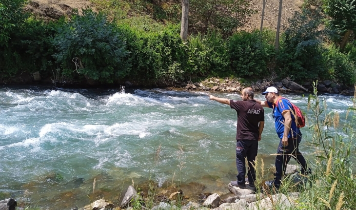 Kayalık ve ağaçlık alanları kontrol eden ekipler, çayda halat bağlanan rafting botlarıyla arama faaliyetini gerçekleştiriyor.