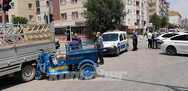 Konya’nın Ereğli ilçesinde otomobil ile üç tekerlekli motosikletin çarpışması sonucu meydana gelen trafik kazasında motosikletin sürücüsü yaralandı. Kaza anı güvenlik kamerası tarafından kaydedildi.