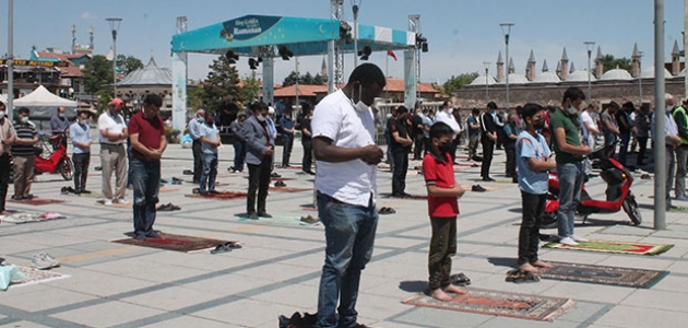 Sultan Selim Camisine cuma namazını kılmak için gelen vatandaşlar, Mevlana Meydanında da saf tuttu. Vatandaşlar namazlarını maske ve mesafe kuralına riayet ederek eda etti.