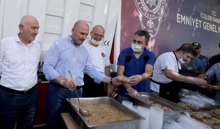 Bakan Soylu, EGM'nin mobil mutfağında yapılan aşureden vatandaşlara ikram ederek, onlarla sohbet etti.