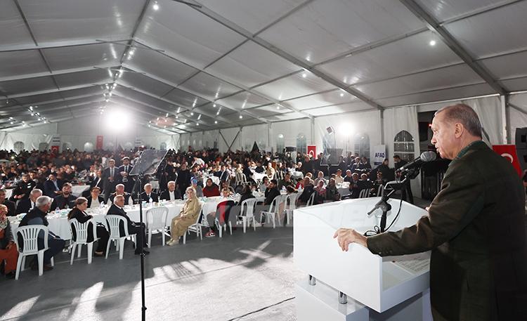 Cumhurbaşkanı Erdoğan, Hatay'la birlikte 11 ili vuran ve yaklaşık 14 milyon kişiyi doğrudan etkileyen depremin acısını 85 milyonun yaşadığını dile getirerek, "Nerede olursak olalım, kalplerimiz siz depremzedelerimizle birlikte atıyor. Buradaki kardeşlerimiz sıkıntı çekerken hayatı normal akışına bırakmayı, başka işlerle uğraşmayı kendimize zül addediyoruz. Deprem turisti misali arada bir buraya uğrayıp fotoğraf çektirdikten sonra sırra kadem basanlar gibi değiliz. Asla da olmayacağız." diye konuştu.