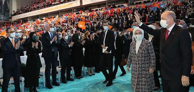 "Sadece kadın kollarımızın üye sayısı 5,5 milyon"Hayata geçirdiğimiz reformlarla kızlarımızın önünü sinsice kesenlere hep birlikte cevap verdik. Yeri geldi buradaki birçok hanım kardeşimizin üniversitelere girmek isterken önleri kesilmedi mi? Şu anda içimizde üniversite kapılarından geri çevrilen birçok hanım kardeşimiz var. Geri çevrilenler söke söke o üniversiteleri bitirdiler. Hem Meclis'te hem de kamuda kadın sayısını her alanda artırdık.