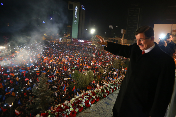 AK Parti Genel Başkanı ve Başbakan Davutoğlu, "Milletimiz bugün, Türkiye'ye karşı kurulan kumpasları tümüyle çökertmiştir. Yeni Türkiye düşmanlarının 2013 Mayıs'ında planladığı kumpas bugün bir kez daha çökmüştür, 2013 Aralık'ında planladığı oyun bugün bir kez daha bozguna uğramıştır. 7 Haziran'dan bu yana söylediğimiz gibi, 1 Kasım seçimleri yeni Türkiye'nin referandumuydu, bugün bu referandumda yeni Türkiye'ye mutlak bir şekilde 'evet' denmiştir." dedi.