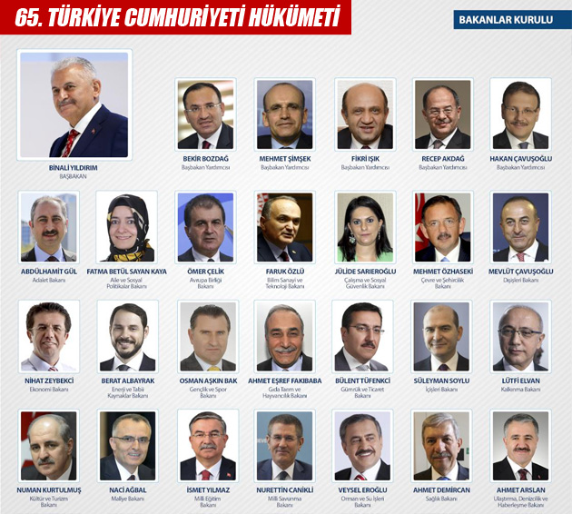 Başbakan Binali Yıldırım tarafından açıklanan 65. Hükümet'te beş Başbakan Yardımcısından dördü değişirken, altı yeni isim de kabineye girdi. Adalet Bakanı Bekir Bozdağ, Sağlık Bakanı Recep Akdağ ve Milli Savunma Bakanı Fikri Işık ve Bursa Milletvekili Hakan Çavuşoğlu da Başbakan Yardımcılığına getirildi.