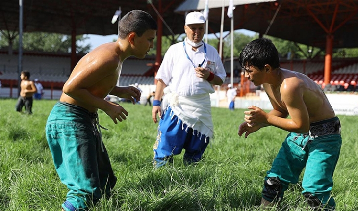 Tarihi Sarayiçi Er Meydanı'nda kule hakemlerinin çağrısıyla sahaya gelen minik 1 boy pehlivanları, rakipleriyle kol bağlamaları sonrası peşreve çıktı.