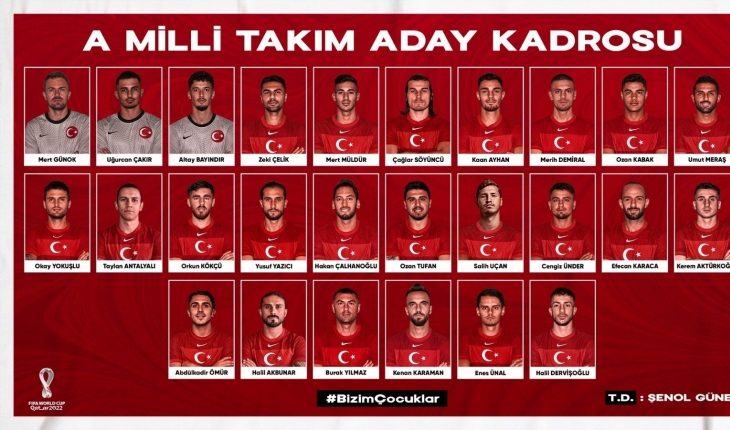 2022 FIFA Dünya Kupası Avrupa Elemeleri’nde Karadağ, Cebelitarık ve Hollanda'yla karşılaşacak olan A Milli Futbol Takımı'nın aday kadrosu açıklandı. Teknik Direktör Şenol Güneş, 26 kişilik kadroda şu isimlere yer verdi: