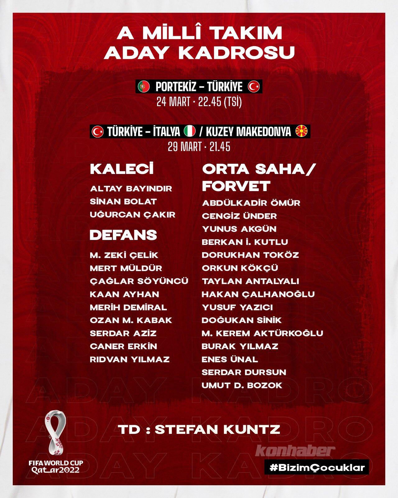 A Milli Takım Teknik Direktörü Stefan Kuntz tarafından belirlenen 27 kişilik kadroda şu futbolcular yer aldı: