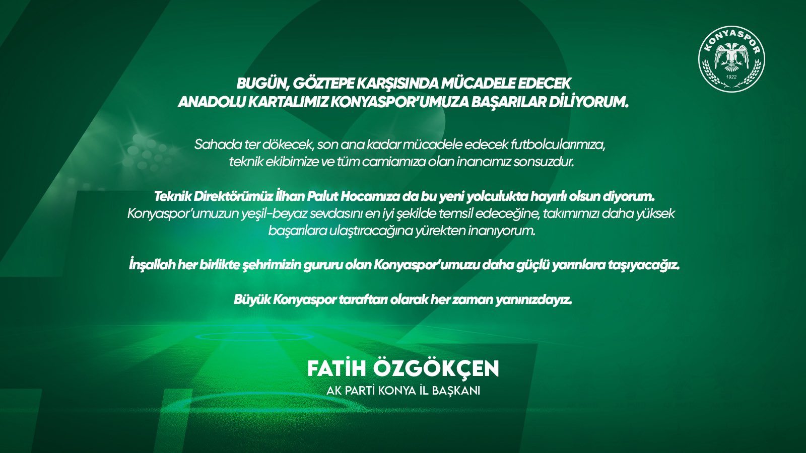 AK Parti Konya İl Başkanı Fatih Özgökçen, bugün Göztepe ile karşı karşıya gelecek olan Konyaspor’a başarı dileklerinde bulundu.