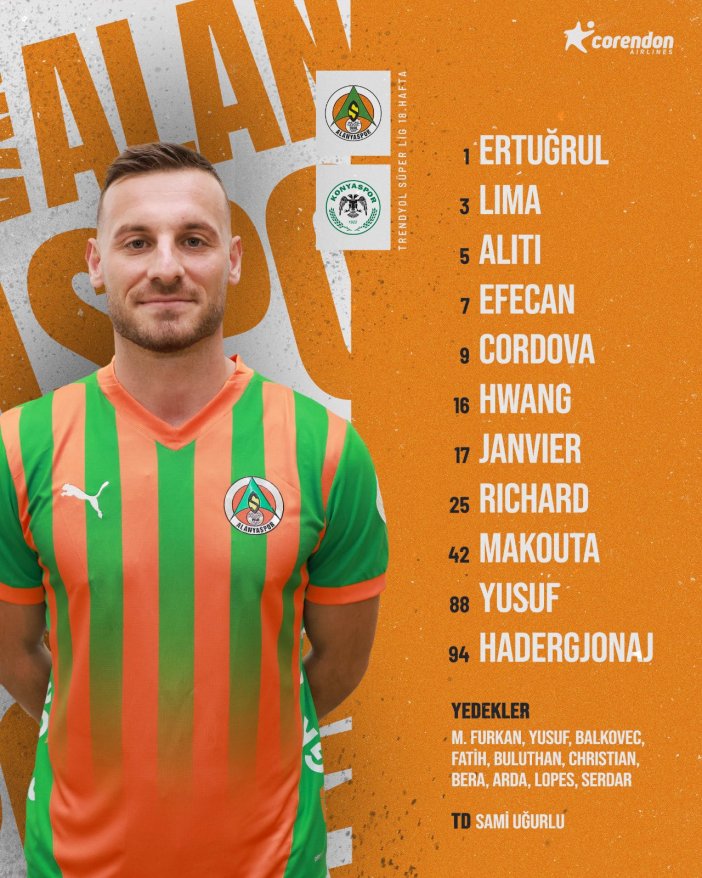 Alanyaspor XI: Ertuğrul Taşkıran, Lima, Aliti, Efecan, Cordova, Hwang, Janvier, Richard, Makouta, Yusuf Özdemir, Hadergjonaj.