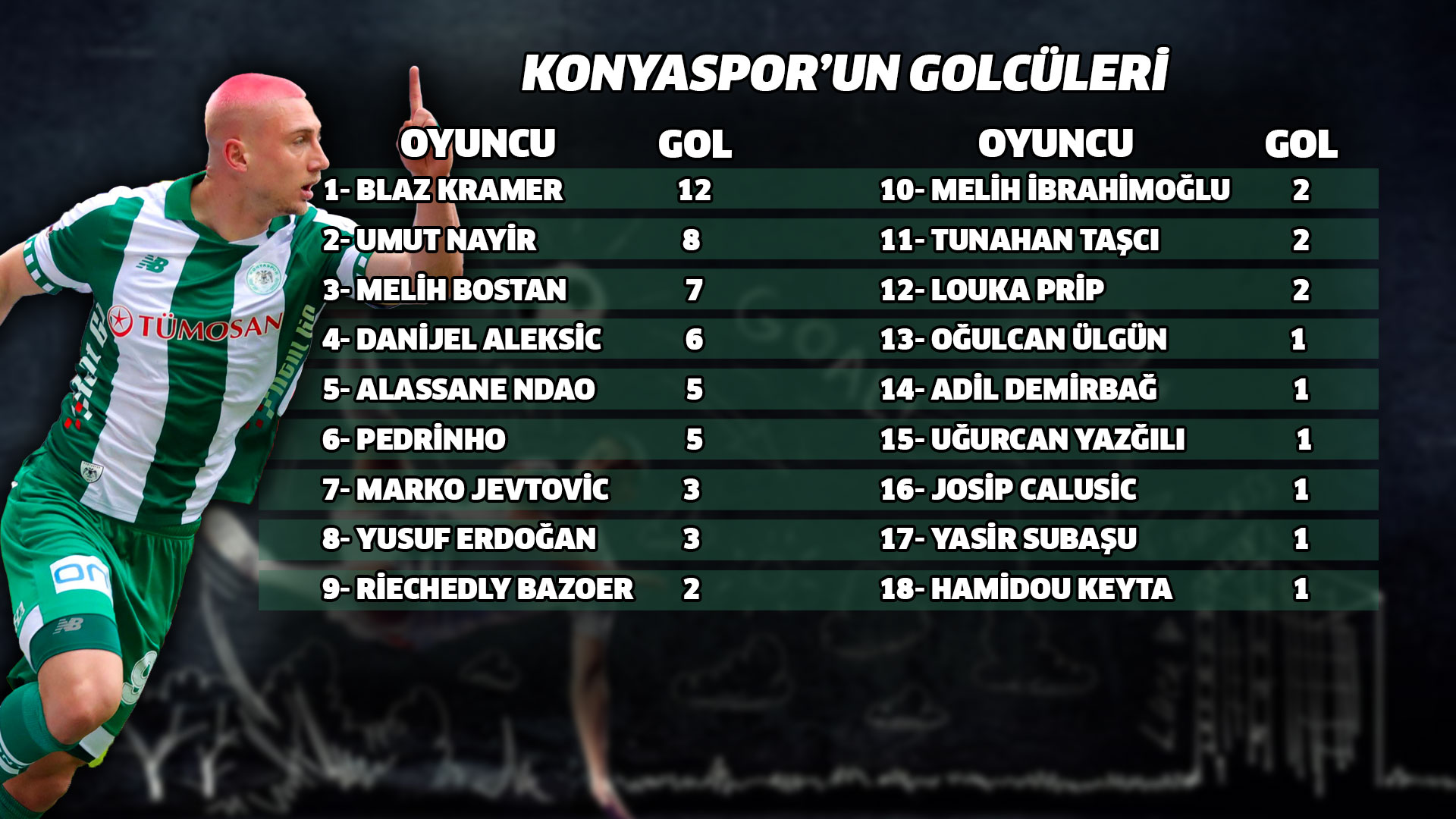 Konyasporlu 18 futbolcu, zorlu geçen 2024-25 sezonunda 67 kez fileleri sarstı. Anadolu Kartalı’nda hem Süper Lig hem de Türkiye Kupası dahil olmak üzere 12 gol atan Blaz Kramer, bu alanda zirvede yer aldı. Listenin devamında 8 golle Umut Nayir, 7 golle Melih Bostan, 6 golle Danijel Aleksic, 5 golle Alassane Ndao ile Pedrinho, 3 golle Marko Jevtovic ve Yusuf Erdoğan, 2’şer golle Riechedly Bazoer, Melih İbrahimoğlu, Tunahan Taşcı, Louka Prip, Oğulcan Ülgün ve Adil Demirbağ yer aldı. 1’er kez gol sevinci yaşayan Uğurcan Yazğılı, Josip Calusic, Yasir Subaşu ve Hamidou Keyta ise listenin son bölümünde kendilerine yer buldu.
