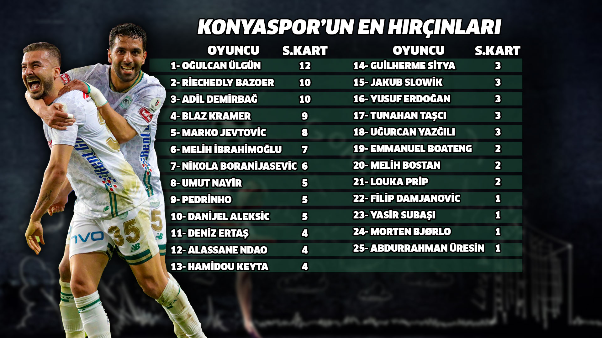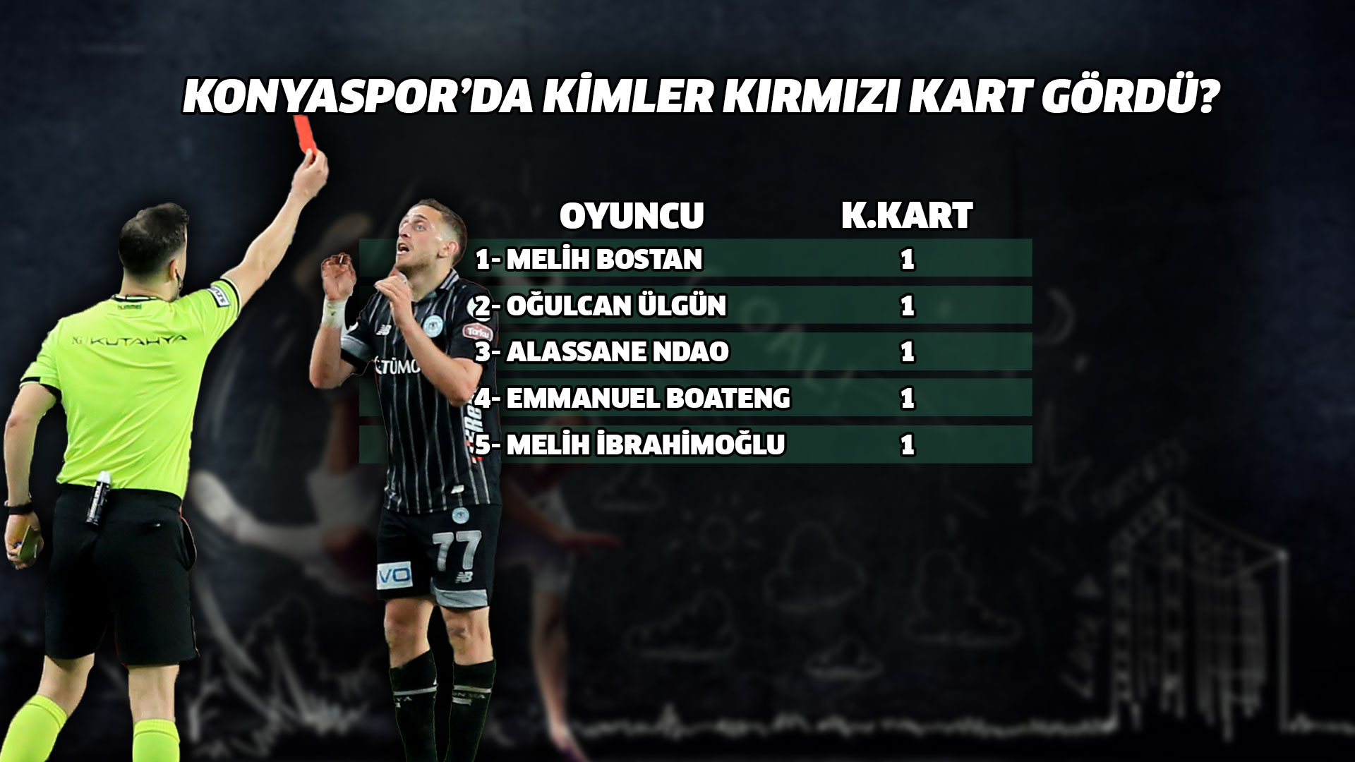 Tümosan Konyaspor’da 5 oyuncu kızardı. Yeşil-beyazlı takımda Melih Bostan, Oğulcan Ülgün, Alassane Ndao, Emmanuel Boateng ve Melih İbrahimoğlu 1’er kez kırmızı kart gören oyuncular oldu.