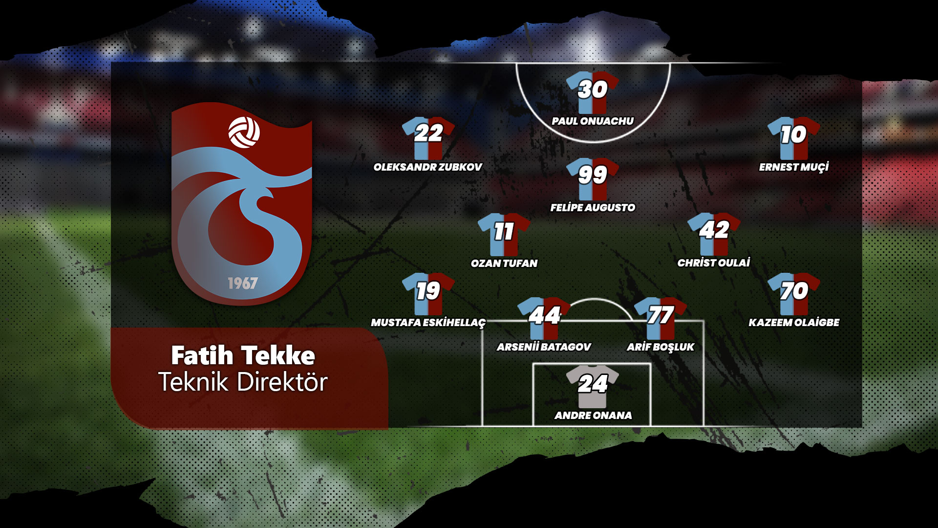 Teknik direktör Fatih Tekke nezaretinde 4-2-3-1 sistemiyle mücadele eden Trabzonspor’un; Konyaspor’a karşı da aynı diziliş ve oyun anlayışıyla sahada yer alması bekleniyor. Bordo-mavililerin kalesinde Andre Onana (24), savunma 4’lüsünde Kazeem Olaigbe (70), Arif Boşluk (77), Arsenii Batagov (44) ve Mustafa Eskihellaç (19), 2’li ön liberoda Christ Oulai (42) ve Ozan Tufan (11), 3’lü orta alanda Ernest Muçi (10), Felipe Augusto (99) ve Oleksandr Zubkov (22), tekli forvet hattında ise Paul Onuachu’nun (30) görev alması bekleniyor.