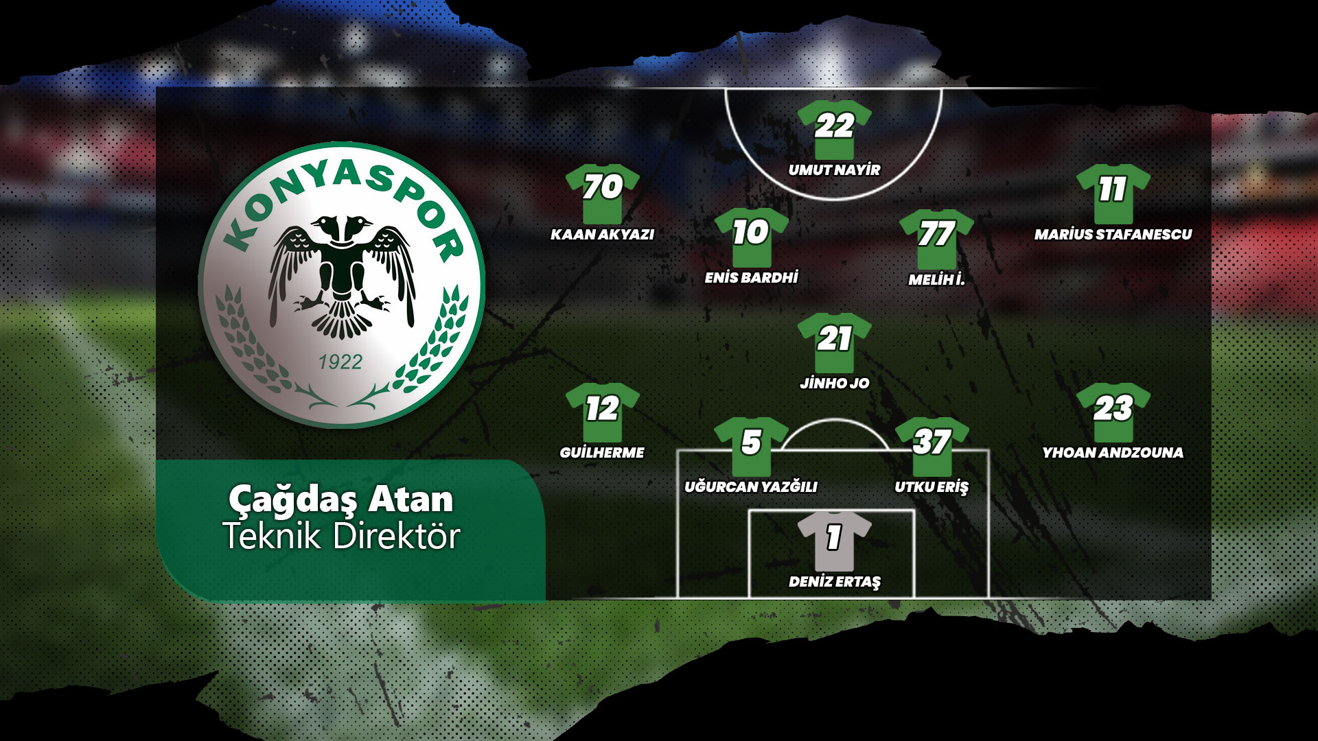 Teknik direktör Çağdaş Atan nezaretinde 4-1-4-1 dizilişiyle mücadele eden Konyaspor’un; Trabzonspor maçında da aynı diziliş ve oyun anlayışıyla sahada yer alması bekleniyor. Anadolu Kartalı’nın kalesinde Deniz Ertaş, (1), savunma 4’lüsünde Yhoan Andzouna (23), Muzaffer Utku Eriş (37), Uğucan Yazğılı (5) ve Guilherme Sitya (12), tekli ön liberoda Jinho Jo (21), 4’lü orta alanda Marius Stafanescu (11), Melih İbrahimoğlu (77), Enis Bardhi (10) ve Kaan Akyazı (70), forvette ise Umut Nayir’in (22) forma giymesi bekleniyor. (Büşra Üstündağ)